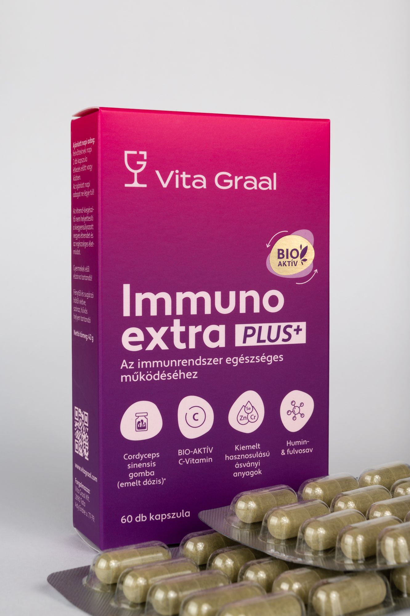 Ezen termékünkre is igazán büszkék vagyunk. Az Immuno extra PLUS+ megnövelt mennyiségű összetevőket tartalmaz az Immuno extrához képest, illetve a termékben található összetevők körét tovább bővítettük (több antioxidáns hatású, felszívódást segítő növény polifenol – citrus biflavonoidok, kvercetin, rutin került bele) . A terméket jó szívvel ajánljuk, ha egy nagyobb igénybevételnek van kitéve a szervezet, legyen az stressz, átlagosnál nagyobb fizikai terhelés, pl. aktív sport, illetve amikor az immunrendszer támogatására valamely okból jelentősen szükség van.